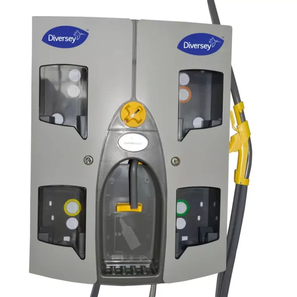 QuattroSelect, da Diversey, é um sistema de diluição altamente eficiente para espaços de média e grande dimensão. Funciona como um armário, que tranca com chave e tem a capacidade para armazenar até quatro bolsas de produto concentrado. Uma diluição 100% segura garante que os colaboradores não entram em contacto com os produtos químicos.
